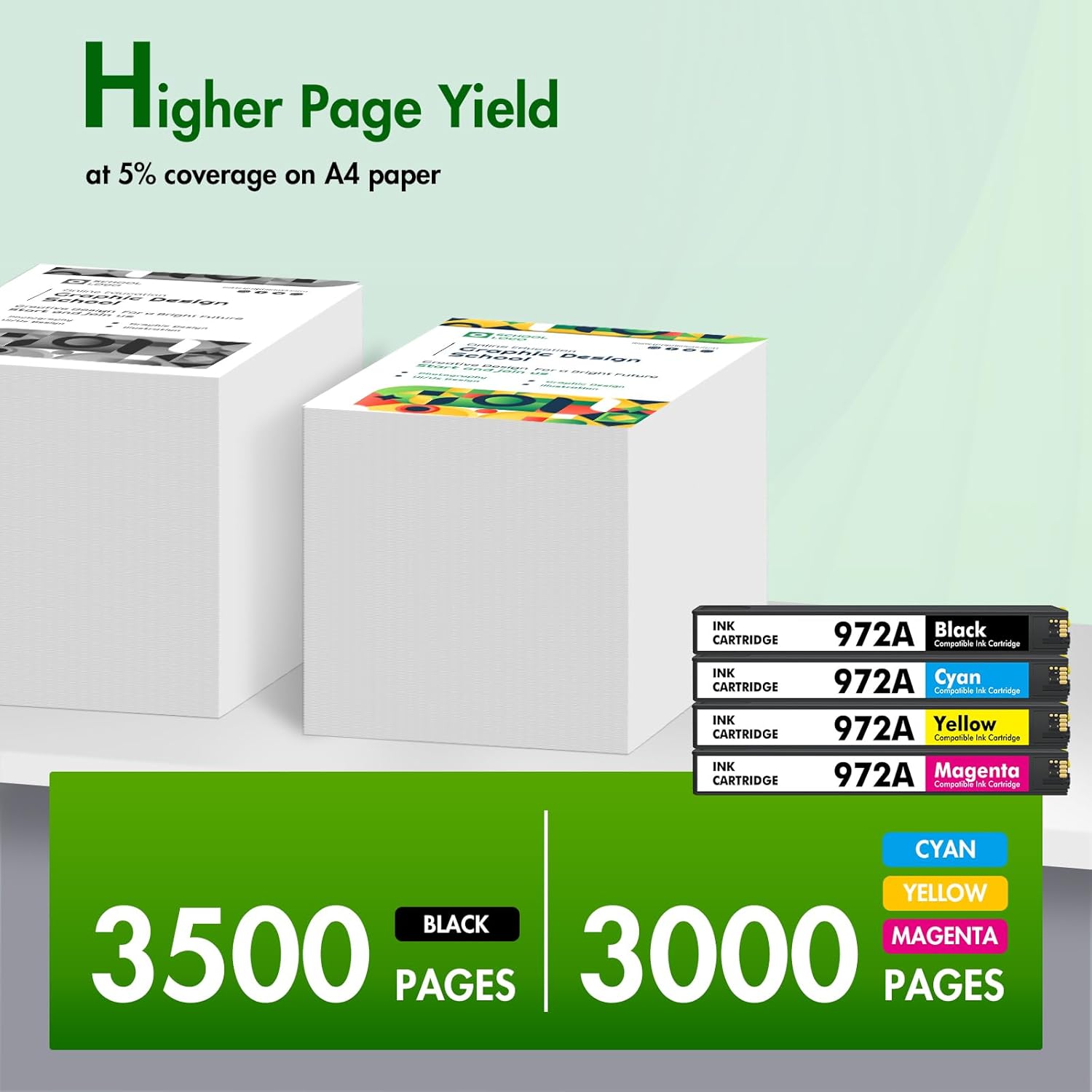 - High Page Yield: Up to 3,500 pages per 972A Black Ink Cartridge, up to 3,000 pages per 972A Color Ink Cartridges (5% coverage at A4 paper)