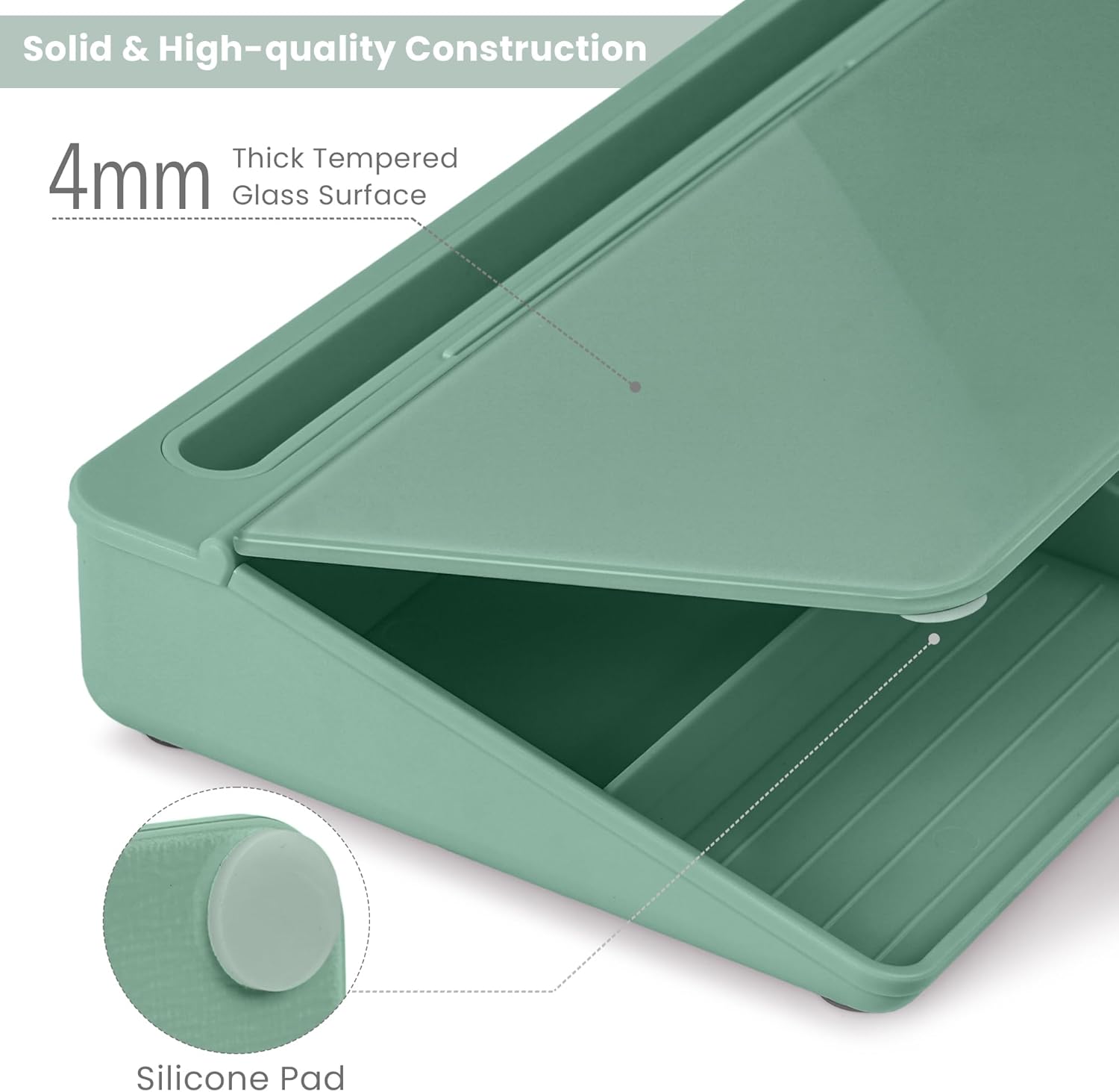 - Multi-function: Other than the glass board and built-in storage box, this product also has a slot on the top which can hold a phone or a tablet.