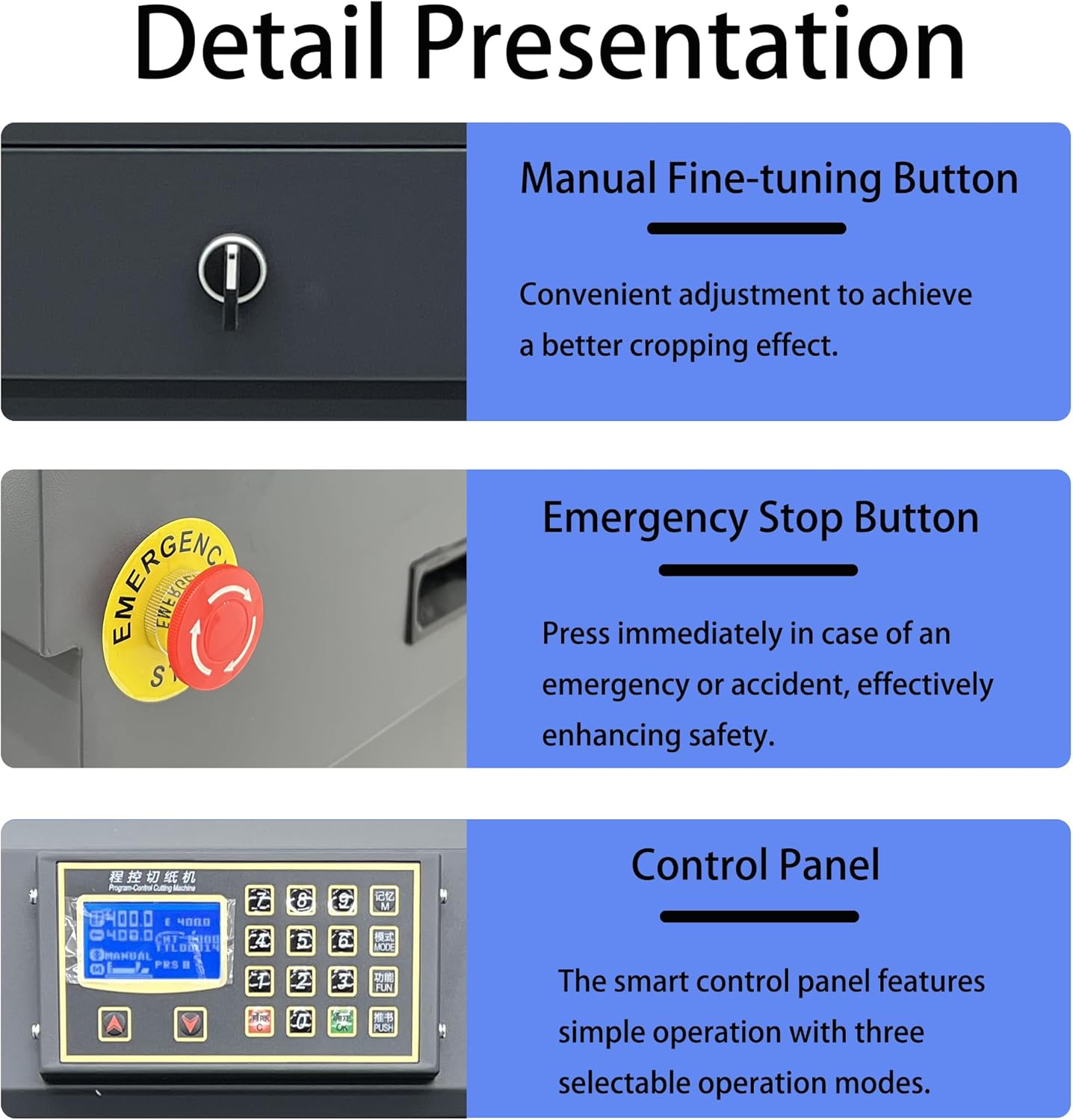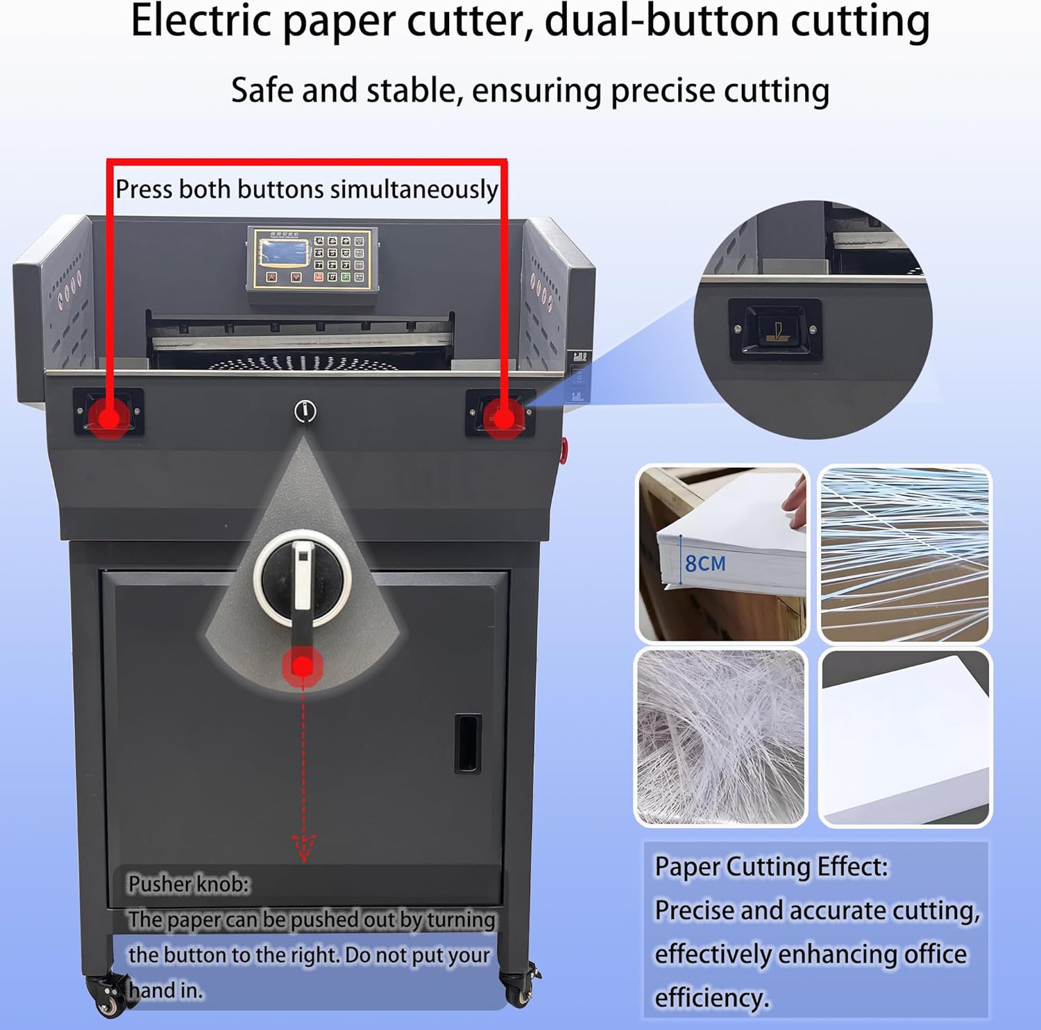- [PROGRAMMABLE AUTOMATION & MEMORY FUNCTION]- This industrial paper cutter revolutionizes repetitive tasks with its intelligent Microcomputer Program Control. Store frequently used cutting dimensions using the dedicated 'M' memory key. Choose from three efficient modes – Manual, Automatic, or Segmented – to perfectly match your workflow. The automatic paper pressing and pushing system securely clamps our material stack and smoothly advances it to the exact programmed position