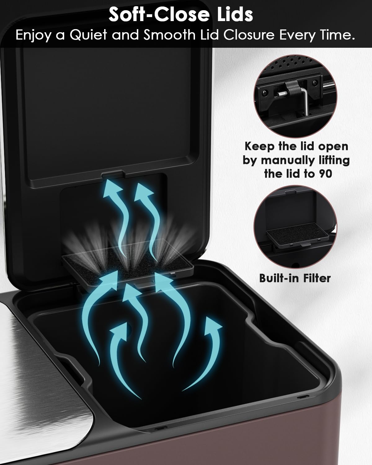 - Built-in Box for Odor Control: Dual trash combo is perfect for the kitchen. Both lids are equipped with built-in box for storaging cleaning material for helping to improve the air quality around the trash can. Enjoy a clean and pleasant environment.