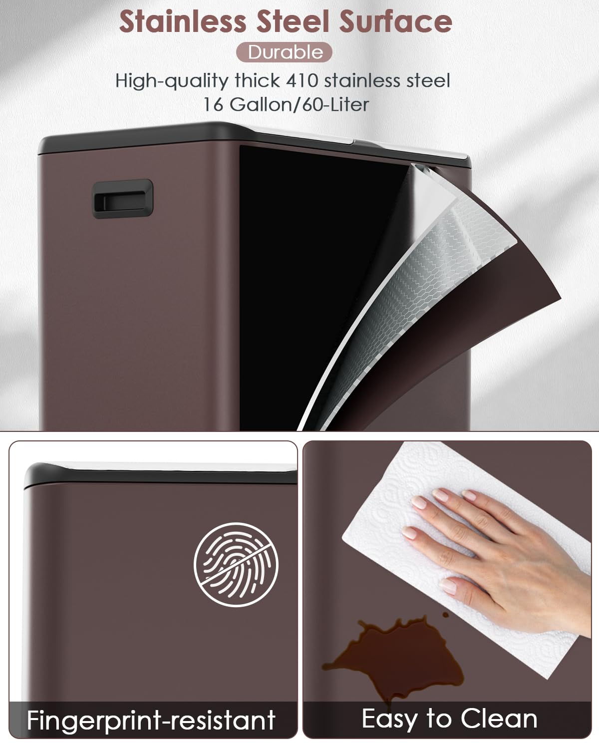 - Stainless Steel Outer &ABS Inner: Step trash can is made of 410 steel metal with a durable surface that is fingerprint-resistant, stain-resistant and easy to clean, you just need to wipe the surface of the trash cans with a damp cloth. Inner buckets are made of ABS material. And bucket is with pocket holes so that you can fix the plastic bags in place.