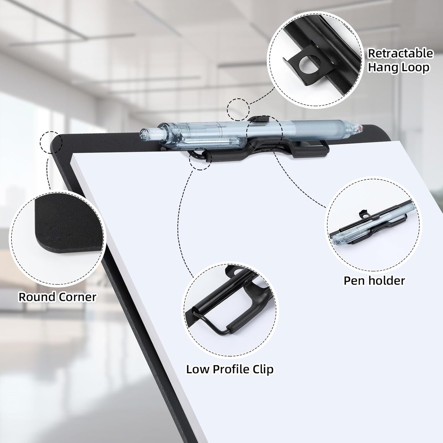 - Retractable Hanging Ring: The hanging clipboard has a retractable hanging ring on the top for easy access, you can hang it up to display the contents of your clipboard or hang it on the wall when not in use to save storage space. The low profile clip is ideal for stacked storage.