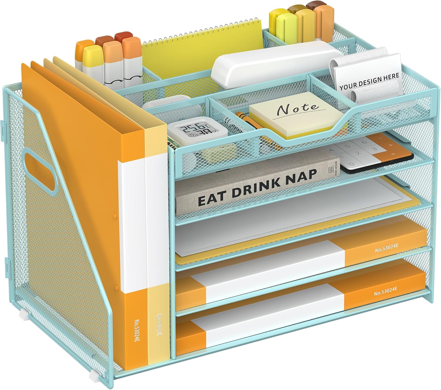 5 Tier Paper Letter Tray with File Holder and 3 Drop-in Pen Holders, Mesh Desk File Organizer with Handle, Desk Organizers and Accessories for School,Home, Office Supplies Storage-Blue