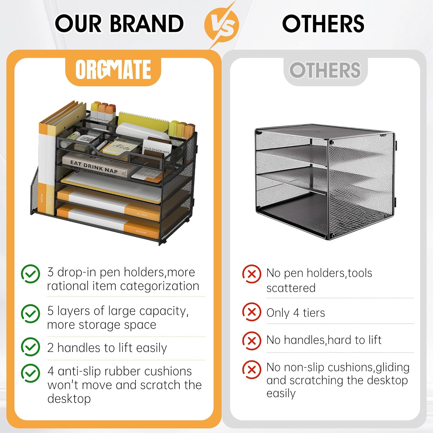 5 Tier Paper Letter Tray with File Holder and 3 Drop-in Pen Holders, Mesh Desk File Organizer with Handle, Desk Organizers and Accessories for School,Home, Office Supplies Storage-Black