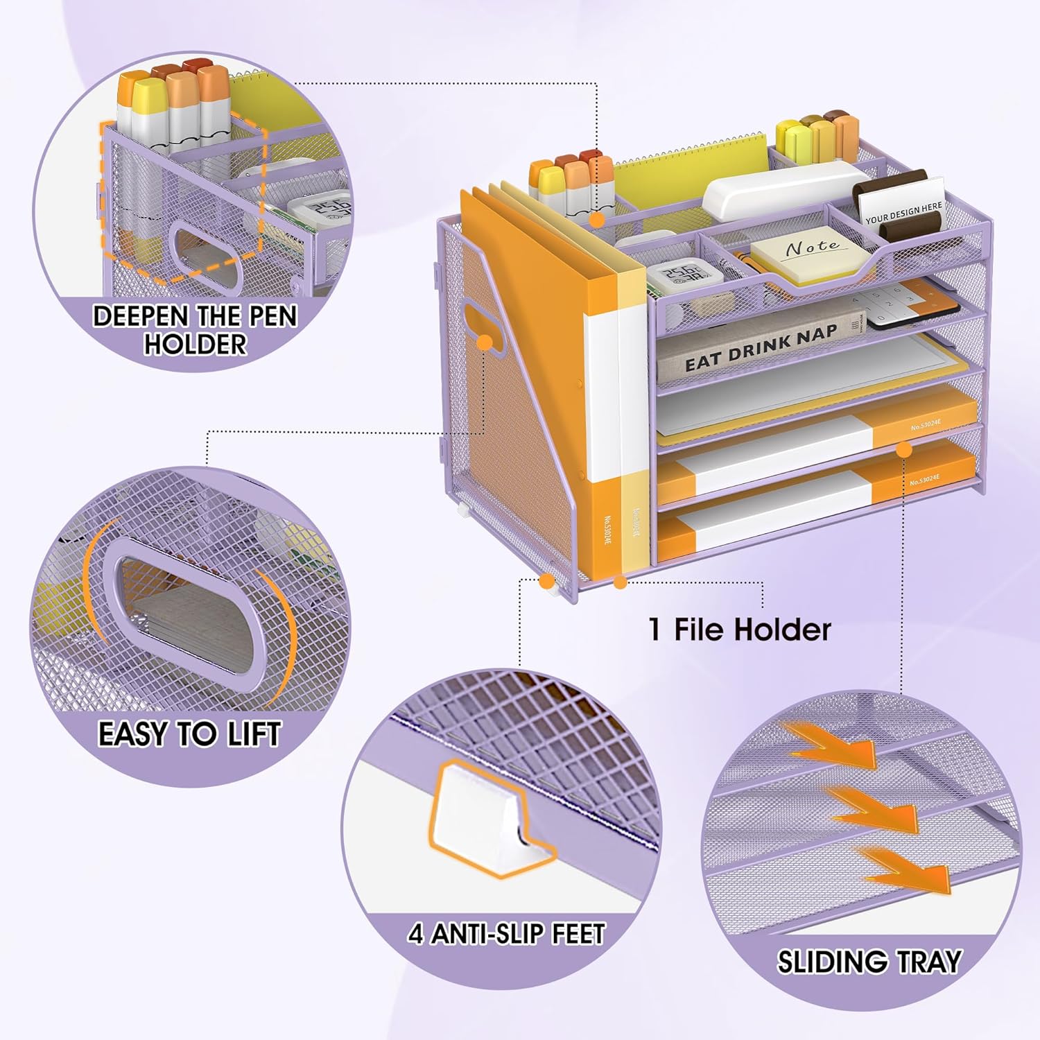 5 Tier Paper Letter Tray with File Holder and 3 Drop-in Pen Holders, Mesh Desk File Organizer with Handle, Desk Organizers and Accessories for School,Home, Office Supplies Storage-Purple