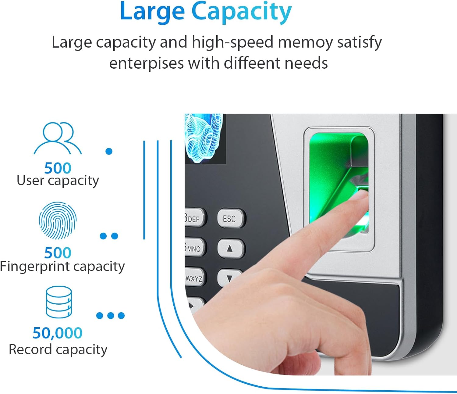 - Large Storage Capacity: Ideal for small to mid-sized businesses, this time clock stores up to 500 fingerprints and 50,000 attendance records. Perfect for teams of up to 500 employees, ensuring reliable performance without frequent data clearing.