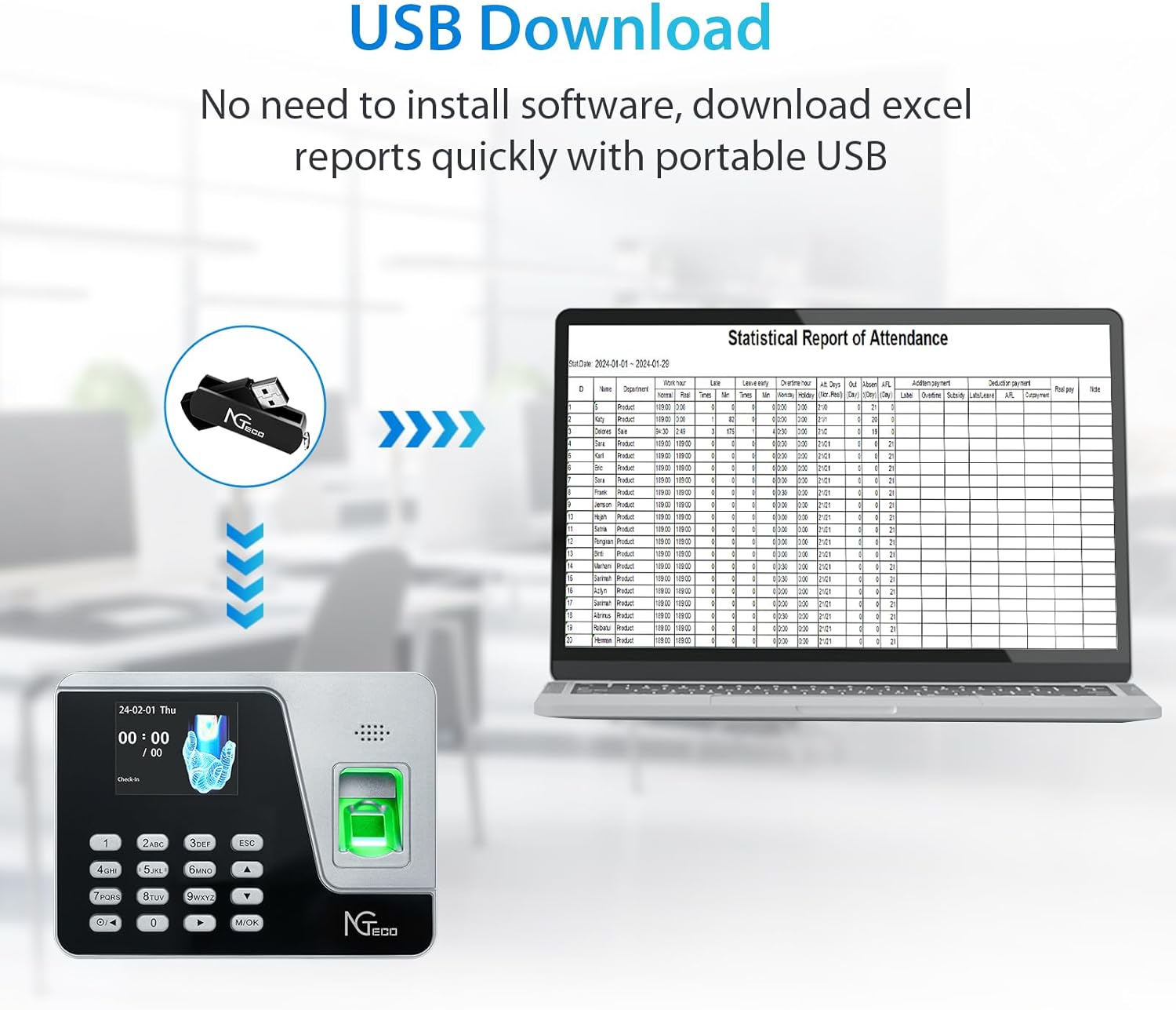 - Standalone & Offline Operation: Enjoy hassle-free time tracking with our smart time clock—no complex software needed! Simply upload and download data via USB flash drive, with reports generated in user-friendly Excel format for easy management.