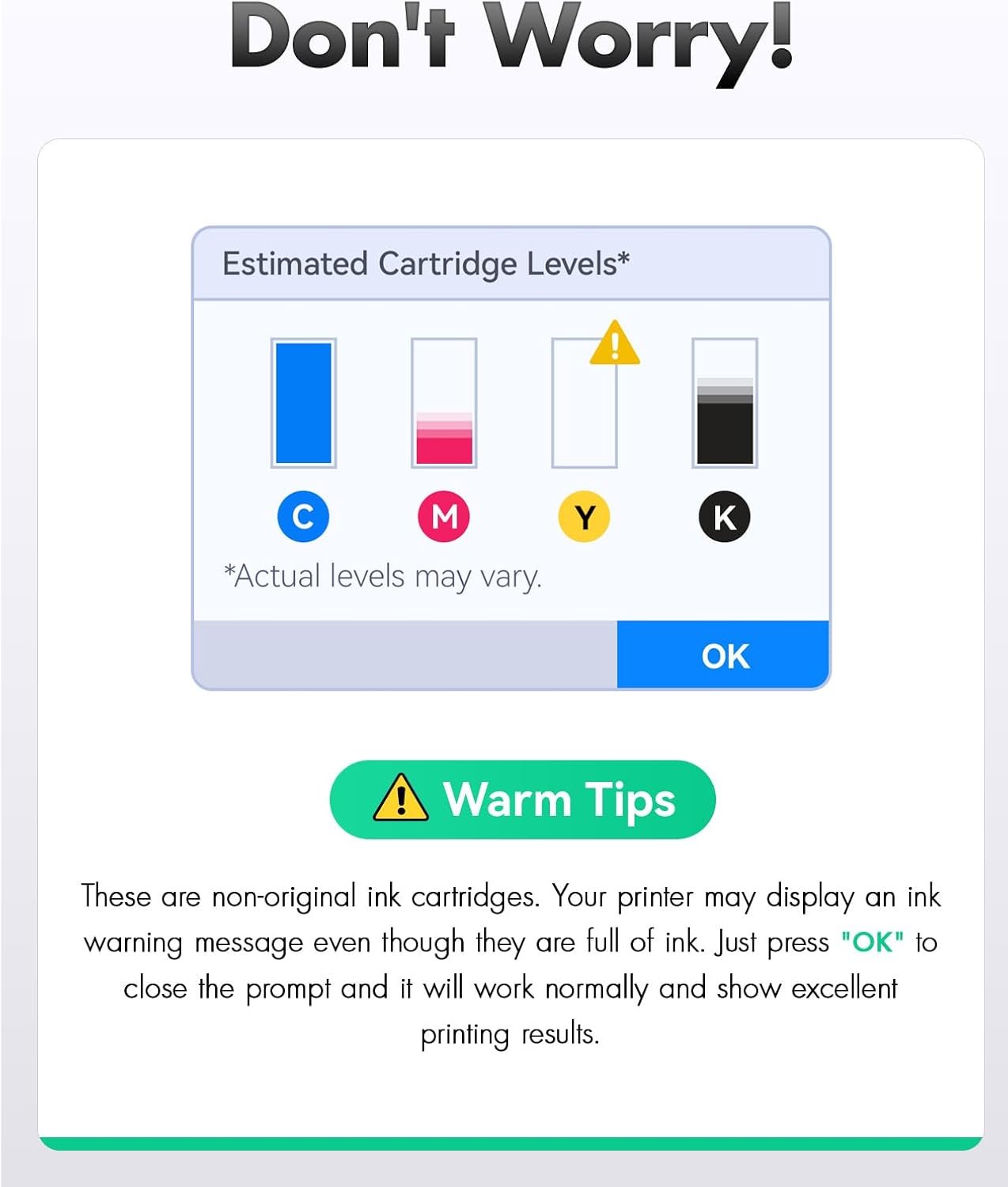 - The latest chip version: Zstint the Ink Cartridges is equipped with the latest upgraded version of the chip, ensuring perfect compatibility with each Ink Cartridges and quick recognition of the printer, allowing you to enjoy efficient and worry-free printing. Our Ink Cartridges have passed ISO9001 certification. High-quality Ink Cartridges meet the demands of high print volumes. Fine ink ensures clear and stain-free printing results and extends the service life of the printer. The printing effect is stable and reliable. You can install and replace it directly without manual adjustment.