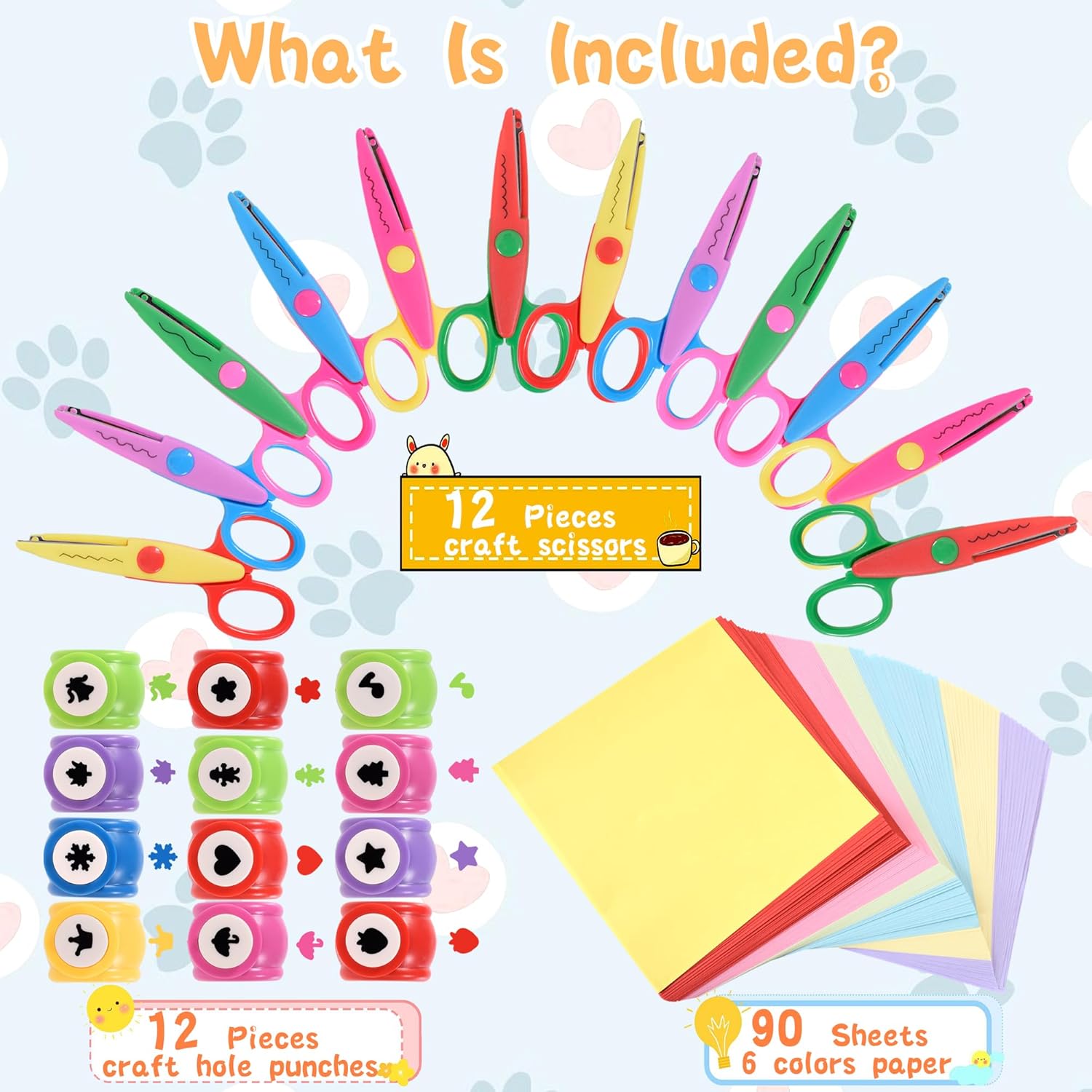 12 PCS Craft Scissors Decorative Edge, 12 PCS Small Hole Punch Shapes, 90 Sheets Colorful Origami, Kids Adults Craft Kit for DIY Crafts, Scrapbooking, Card Making, School Supplies
