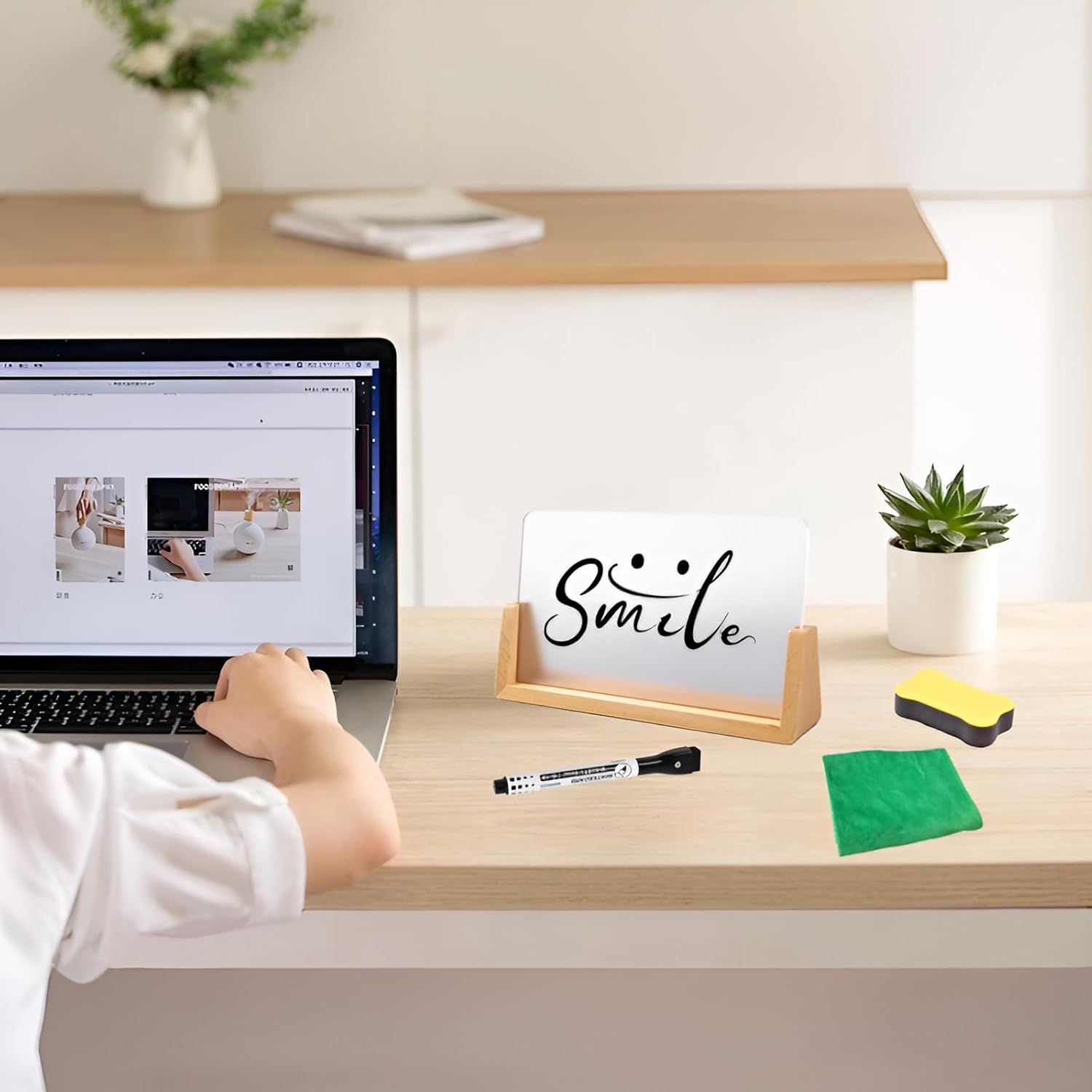 Desktop Glass Whiteboard with Wood Base, 8.46" x5.12" Small Desk Dry Erase Board Mini Whiteboard for Office Home, Accessories Included