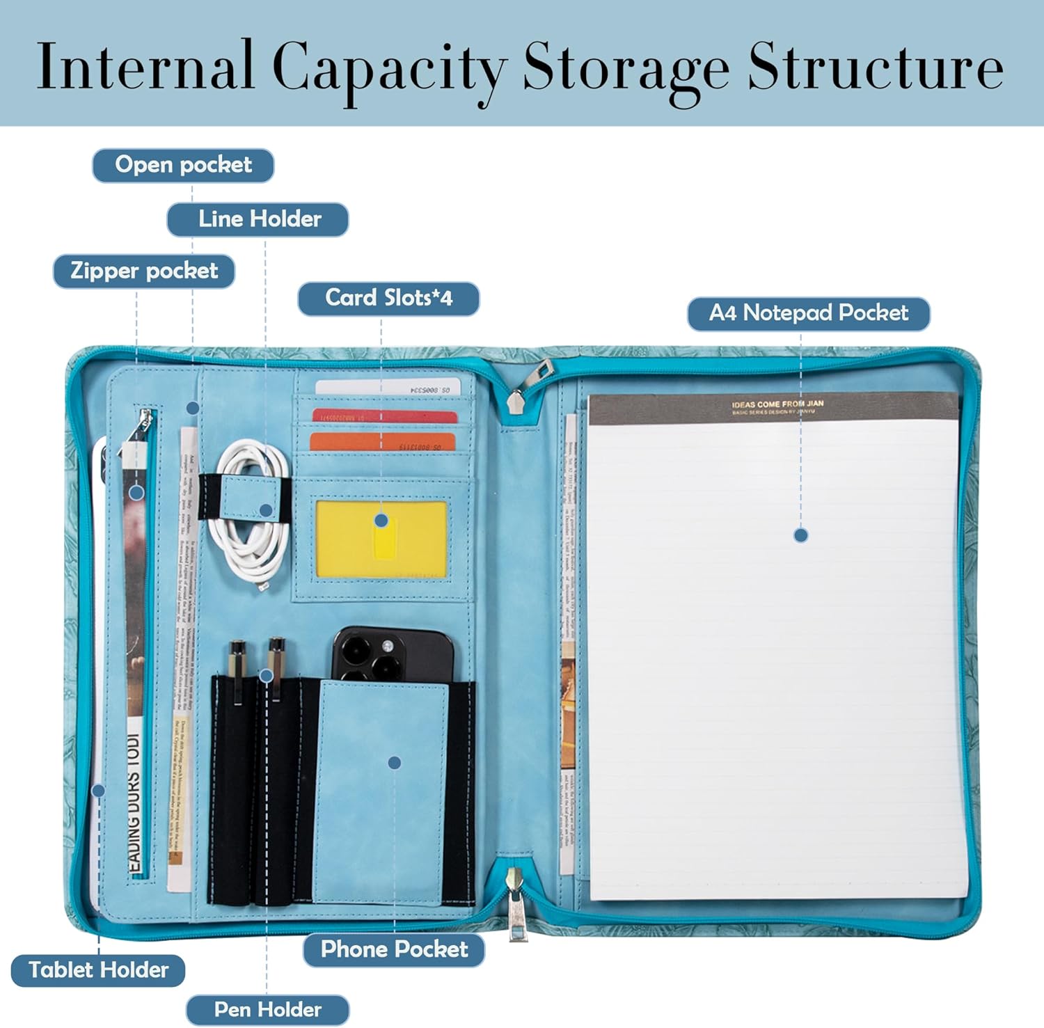 Padfolio with Zipper, Portfolio Binder, Leather Portfolio with Zipper for Men Women, Portfolio Organizer, Padfolio Business Resume A4/Pad, Blue Floral Pattern