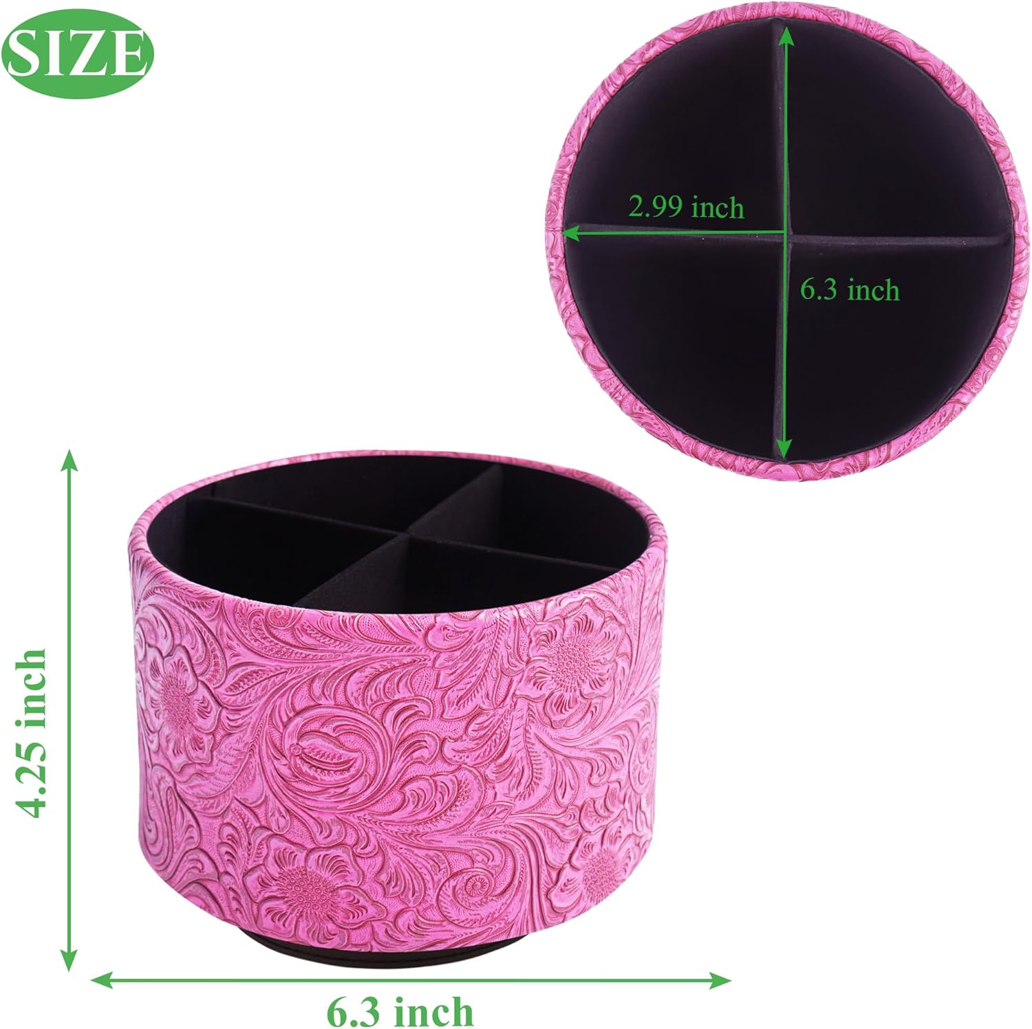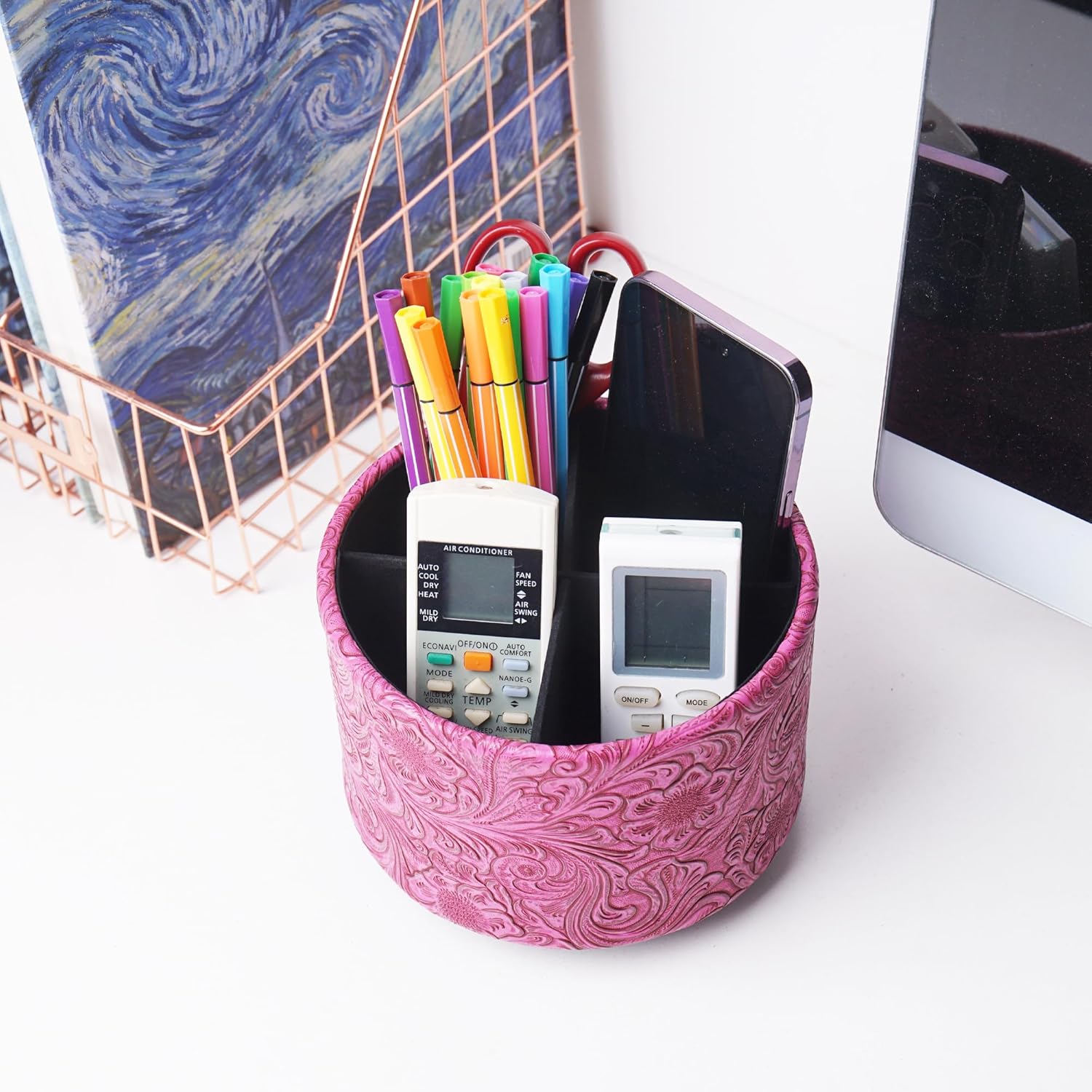 lizimandu Round Leather Art Supply Organizer,Remote Control Holder,360 Degree Spinning,Multi-Functional Pencil Holder,4 Compartments Desktop Stationary Organizer(1-Carved Red2)
