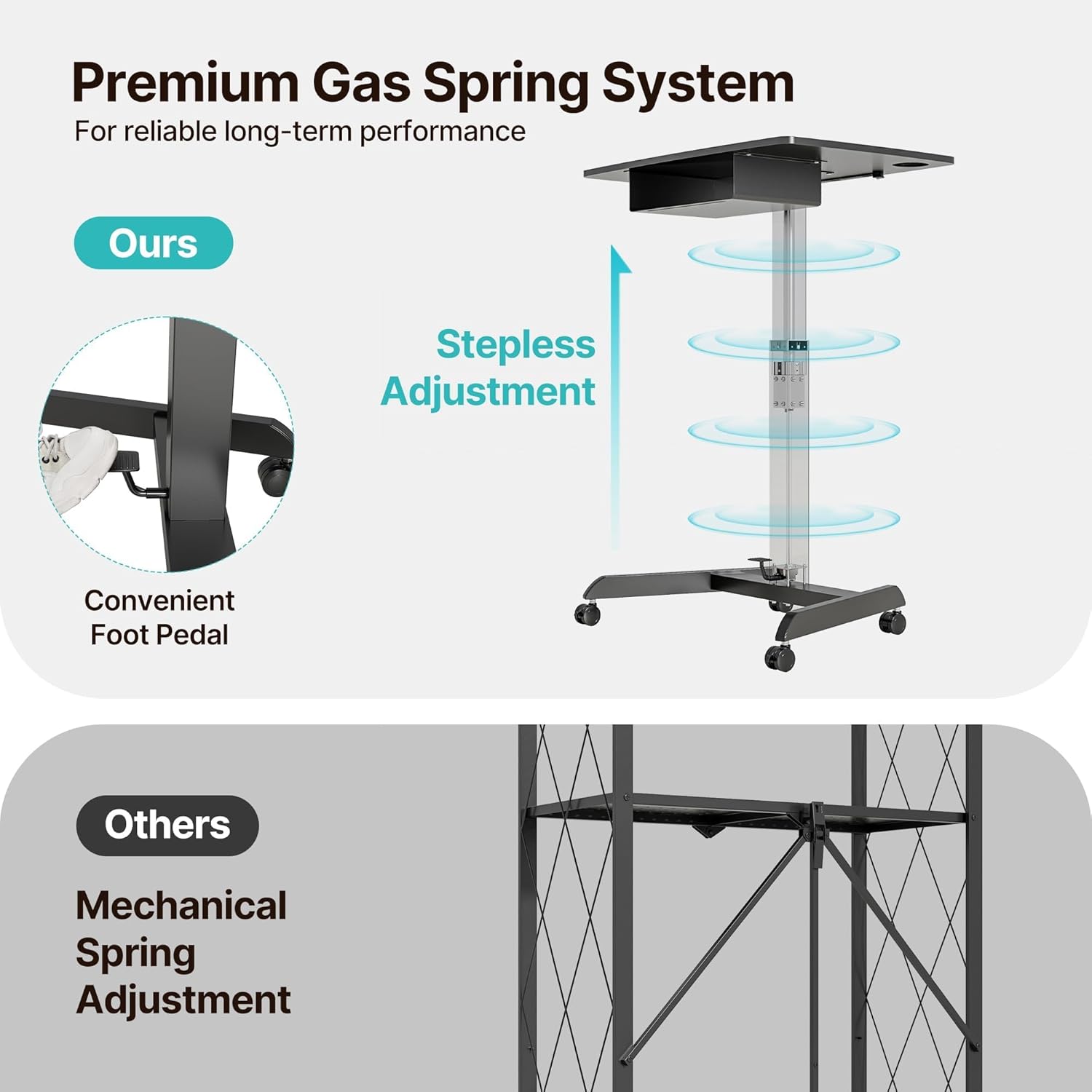 - 【Effortless Height Adjustment 】With a simple foot pedal press, the mobile laptop stand rises smoothly to your ideal height, no bending or tedious adjustments required. The gas spring has endured 20,000 tests. Whether typing, standing briefly, or sliding it back as a adjustable table with wheels for study, the reinforced I-beam base and thickened metal construction create a solid, anchored feel, ensuring lasting durability.