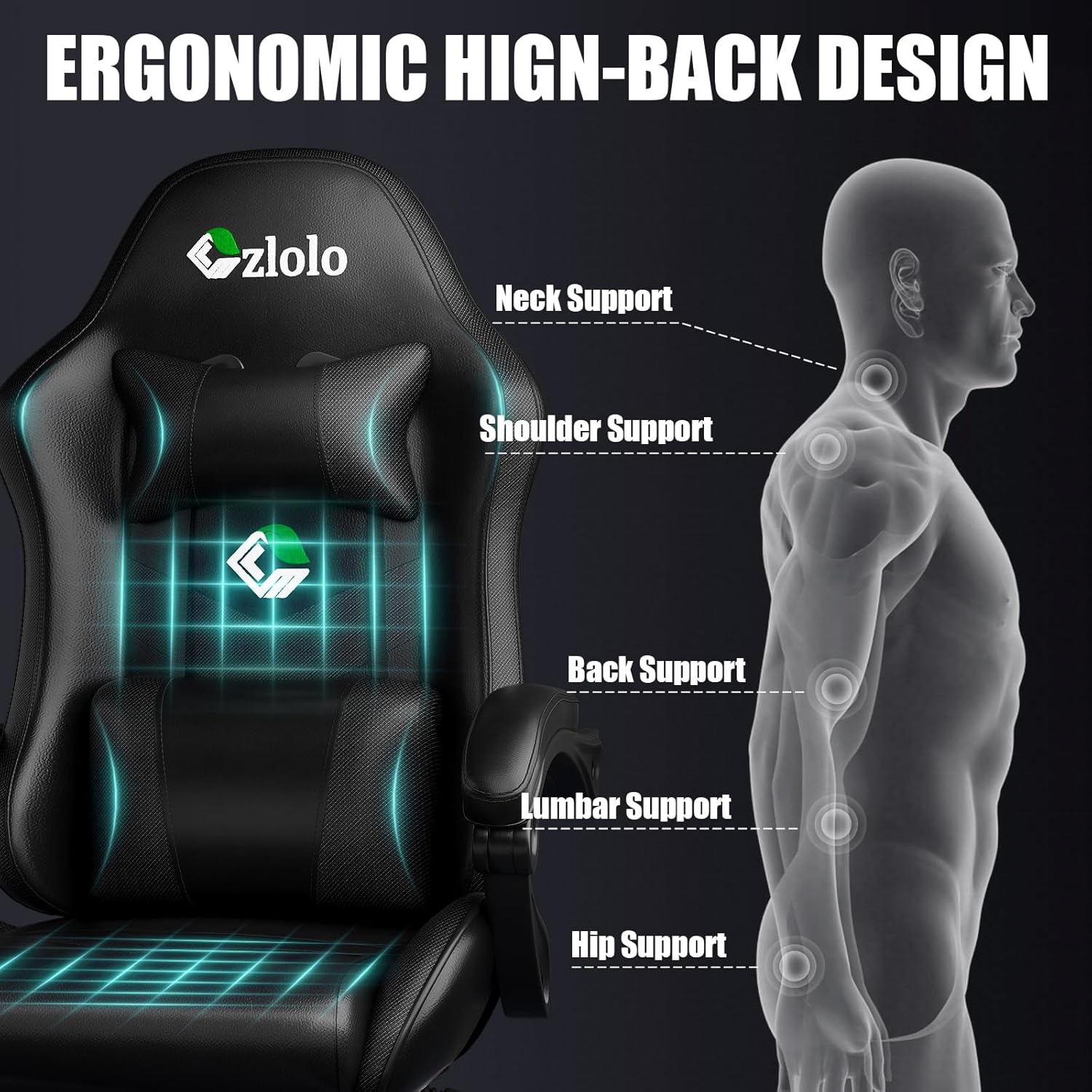 - Ergonomic Black Gaming Chair: There is a small pillow on the top to protect your neck and avoid soreness. The backrest is widened to accommodate your shoulders, making you more comfortable to lean on. and linkage armrests have added sponge pads, you will feel softer.In addition, there is also a big lumbar support pillow with massager that can vibrate to relieve your fatigue.