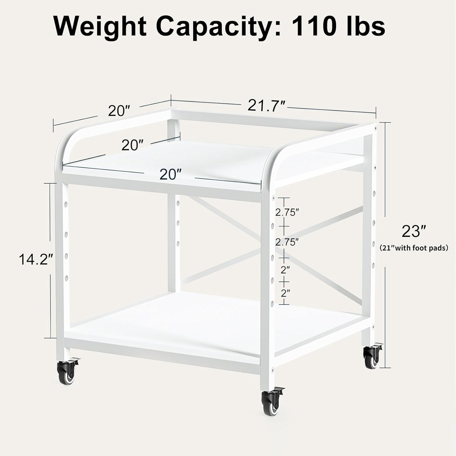 - Large Size & Space: The printer stand measures 20" x 21.7" x 23" and can hold up to 110 lbs. per shelf, ideal for larger laser printers and scanners. The top and bottom shelves are identical, providing ample storage for paper, ink, and supplies to keep your workspace organized.