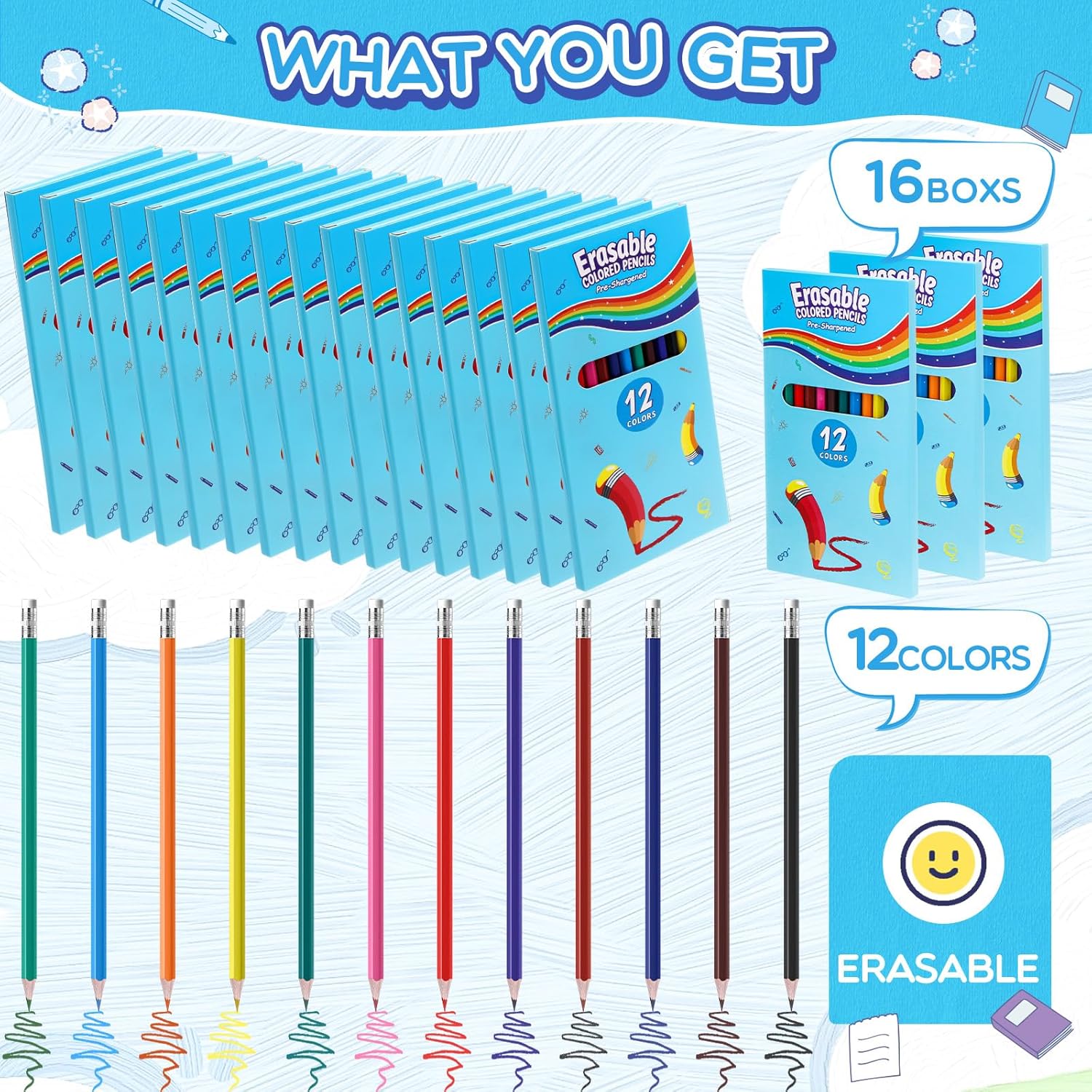 16 Sets 192 Pack Erasable Colored Pencils 12 Colors Pencils Smooth Colors with Erasers for Drawing Sketching Coloring Books Kids Adults Beginners Artists School Coloring Supplies