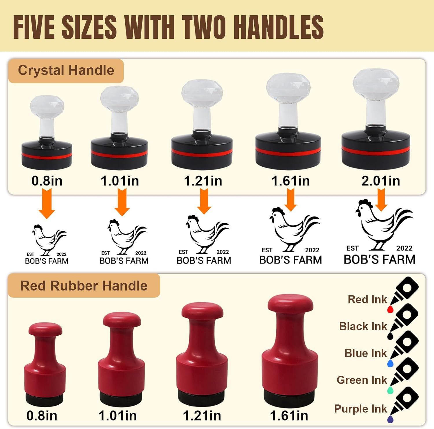- [Different Sizes] - We have 5 different sizes (0.8inches, 1.0inches, 1.2inches, 1.6inches, 2.0inches) in our stores for you to choose and meet your specific egg-stamping needs. These custom egg stamps are designed for versatility, good for any egg size, from backyard chicken coops and homesteads to large chicken farms.