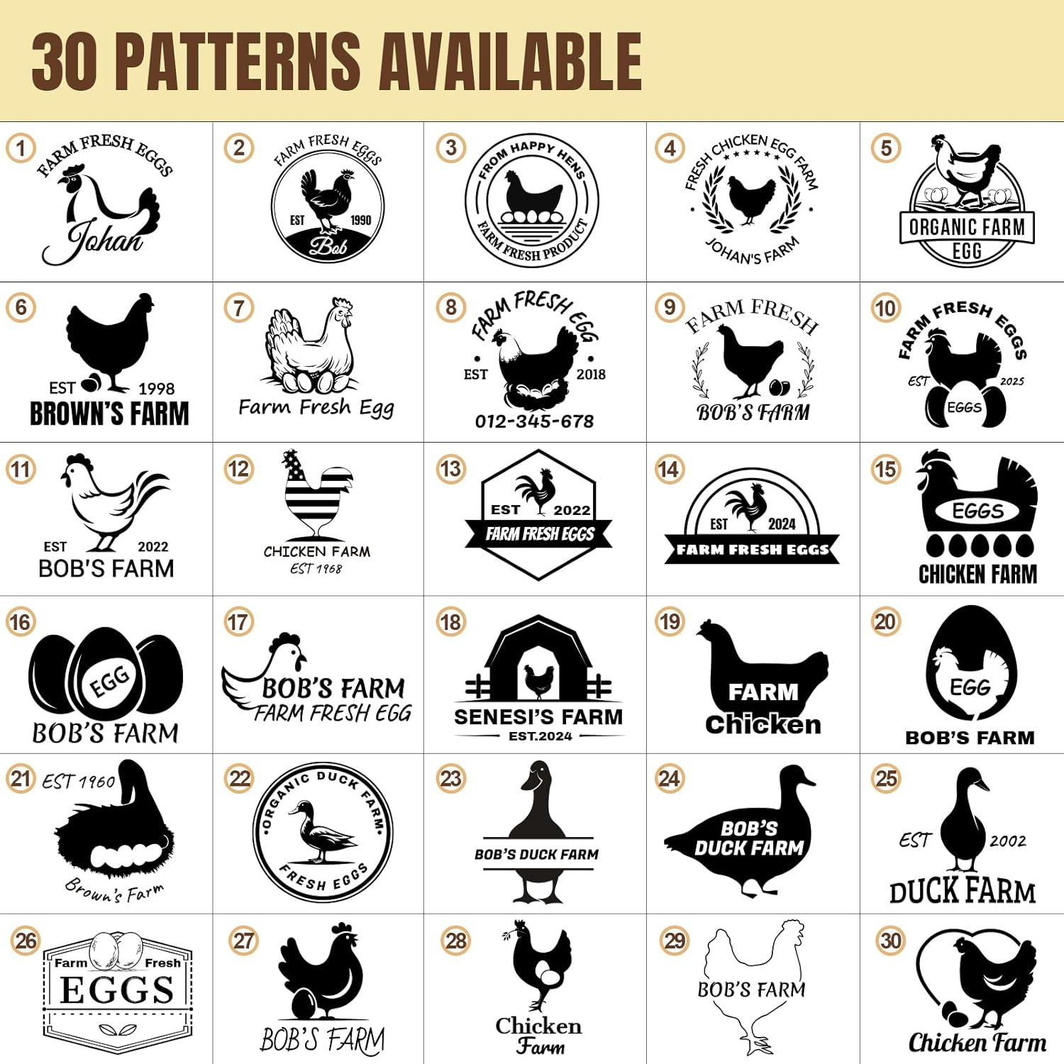 - [30 Creative Personalizable Designs] - Choose from 30 unique designs with our custom egg stamps. You can even upload your own text or logo to showcase your creativity and make your eggs stand out.