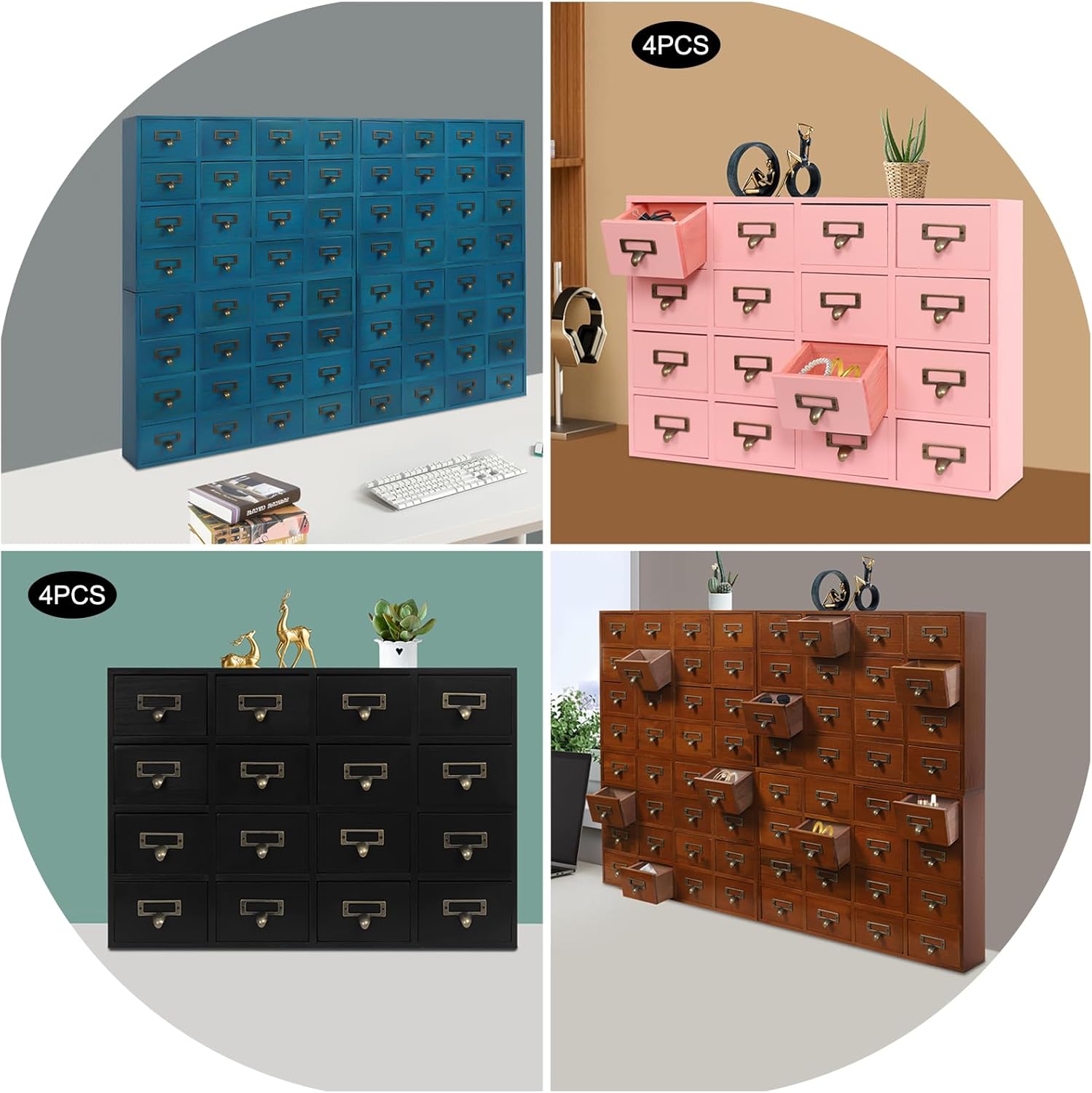 - SET OF 4 - Our package includes 4 pieces of organizers, including a total of 16 large-capacity drawers, which are enough to easily store jewelry, cosmetics, documents, and other small items, making your desktop cleaner. You can use these wooden storage boxes as a set or separately for different areas in your home.