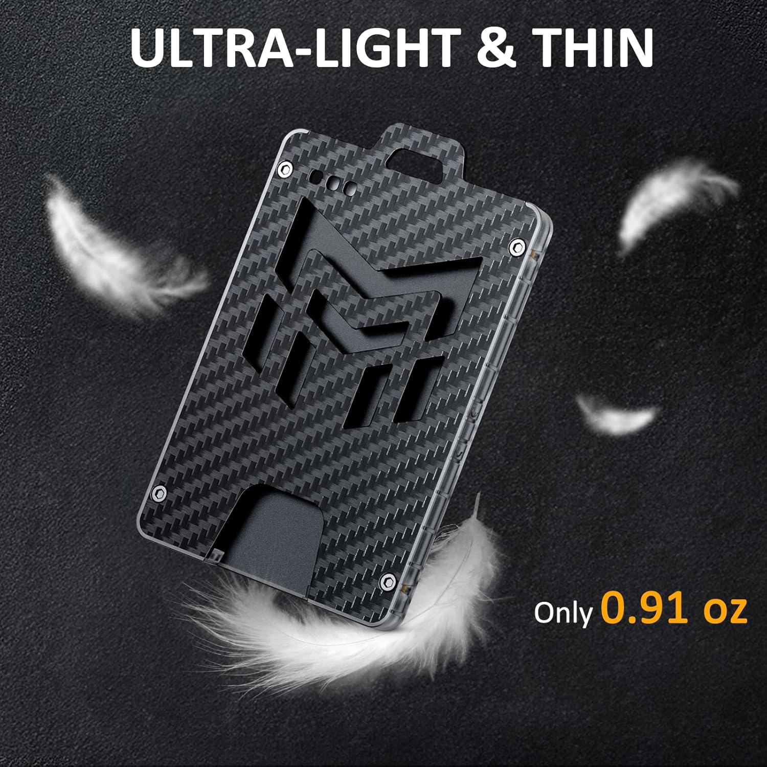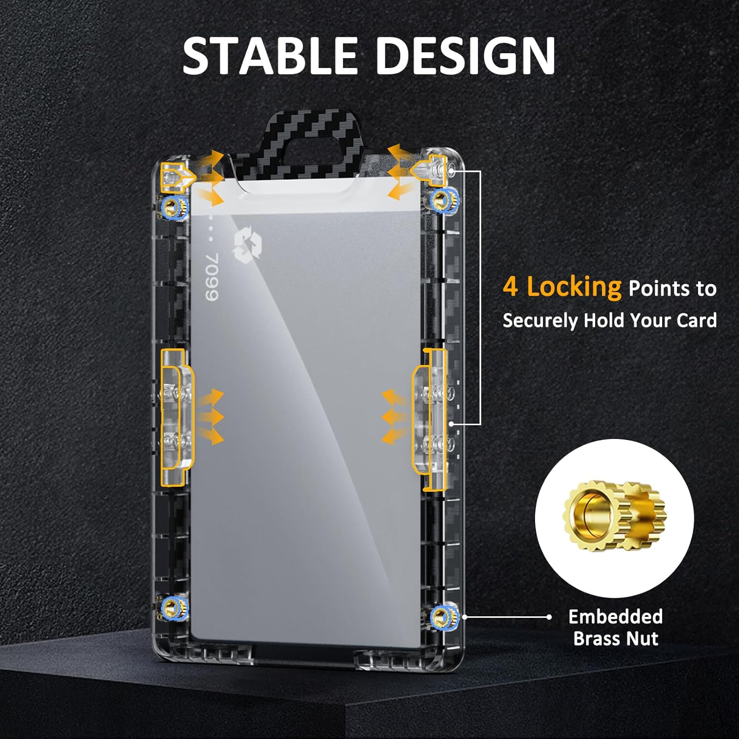 - ππ©π π«ππππ ππππ π ππ¨π₯πππ«--The outer shell is made of ultra-light 3k carbon fiber and PC material, which is lightweight and durable, weighing only 0.91oz. Four elastic points on both sides of the interior ensure your cards are securely fastened. Recessed brass nuts at the four corners securely fasten the carbon fiber plate and polycarbonate shell, eliminating the worry of screws falling out and the badge holder falling apart.