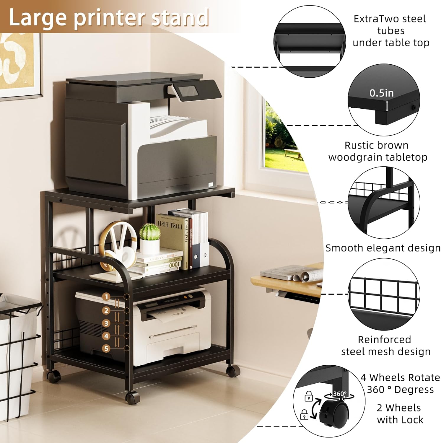 Lerliuo Large Printer Stand with Storage, 23.6"W x 18.9"D x 30.2"H, 5-Adjustable Shelf Heights Mobile 3 Tier Table with Lockable Wheels, Industrial Rolling Printer Cart, Black Stands for Home Office