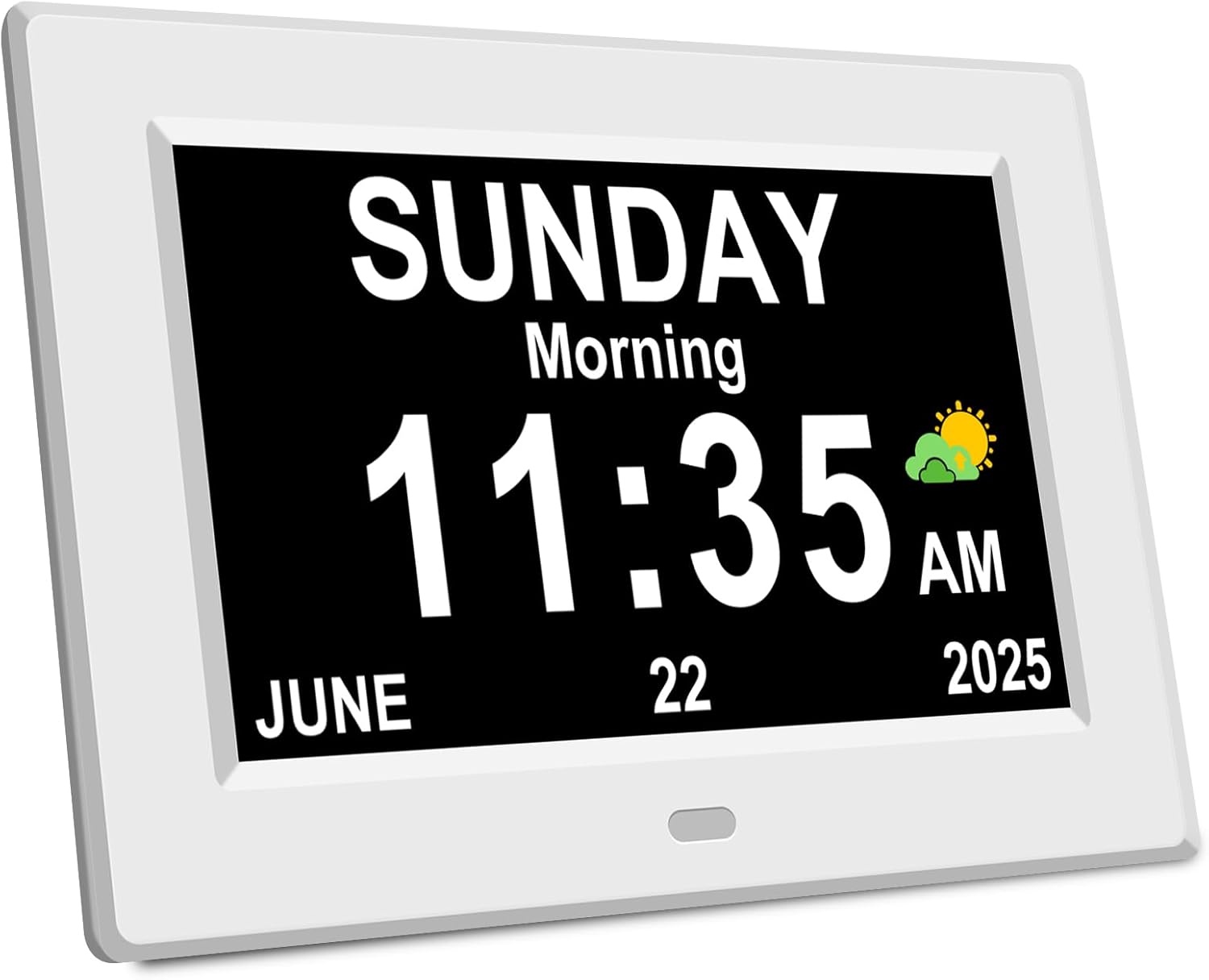 DIWAKREM 7'' Large Display Digital Clock for Seniors, Digital Calendar Alarm Clock for Elderly Clock with Date Day of Week 12 Alarms 4 Colors Desk Wall Clocks for Alzheimers Dementia Auto DST/Dimmer