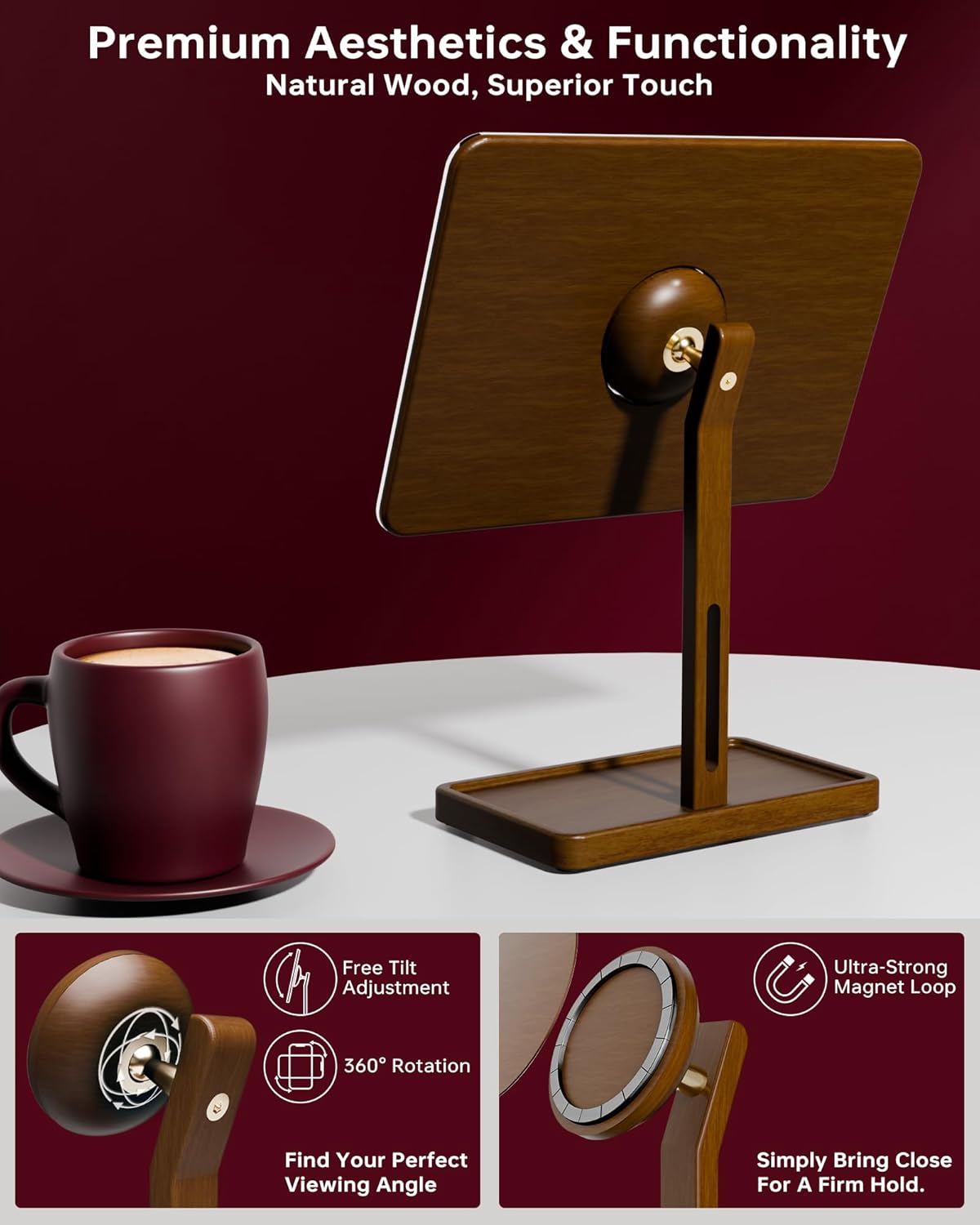 - SPACE-SAVING 3-IN-1 | This innovative product is both a practical small glass mirror and a reliable magnetic phone stand for desk , eliminating clutter and putting everything you need within reach. Crafted from solid wood, glass mirror board, it offers unparalleled durability and a luxurious aesthetic for any professional or home environment.