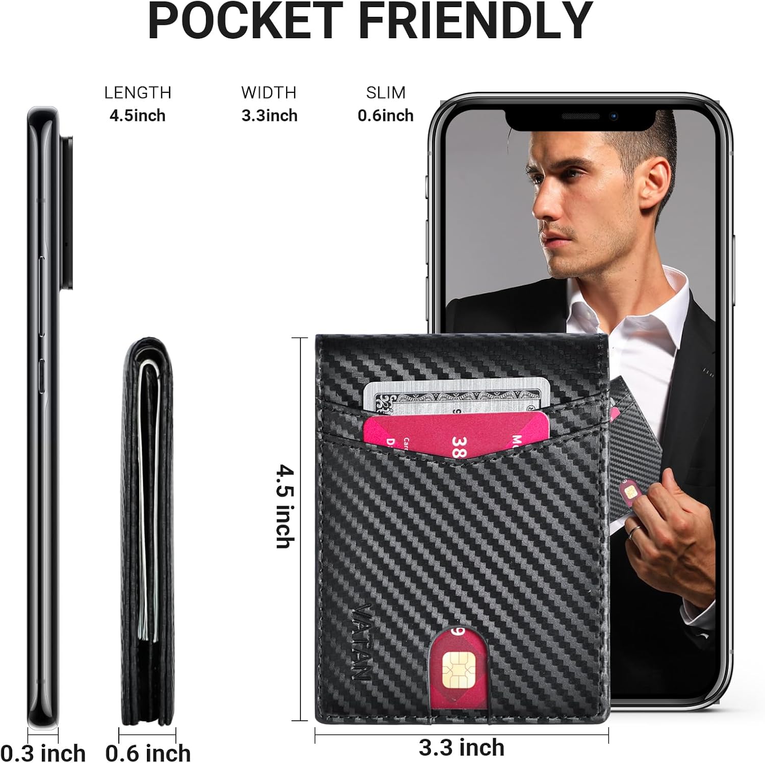 - SLIM BIFOLD WALLET: This minimalist wallet measures 4.5x3.3x0.6 inches, this bifold slim wallet for men can hold up to 15 cards. Its slim profile slips effortlessly into your pocket, making it an ideal choice for everyday carry.