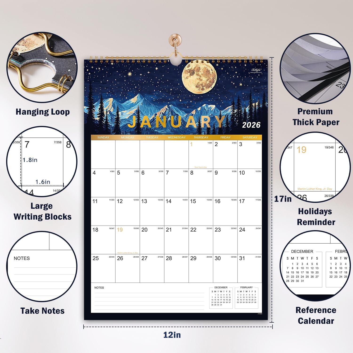 - π² FUNCTIONAL DETAILS - Sturdy golden twin-wire binding for turning pages easily + Unruled daily blocks + Hanging Hole + Premium thick paper for comfortable writing and stored for a long time + Hard cover on the back this large wall calendar 2026 to protect your 2026 large calendar well.