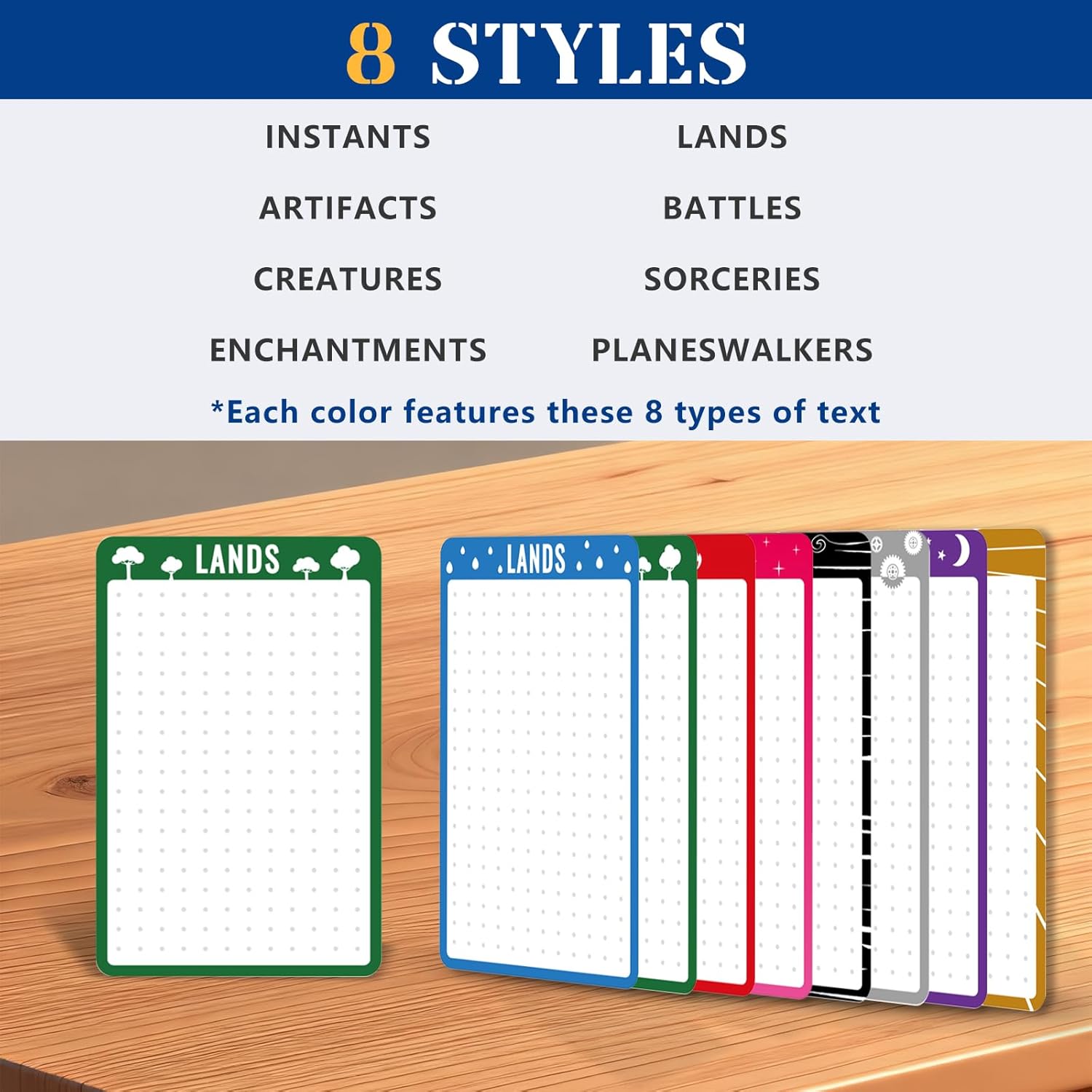 - Comprehensive Set: 200 high-quality trading card dividers total – 192 pre-printed MTG card dividers (24 each in 8 colors) + 8 blank white card dividers for custom labeling.