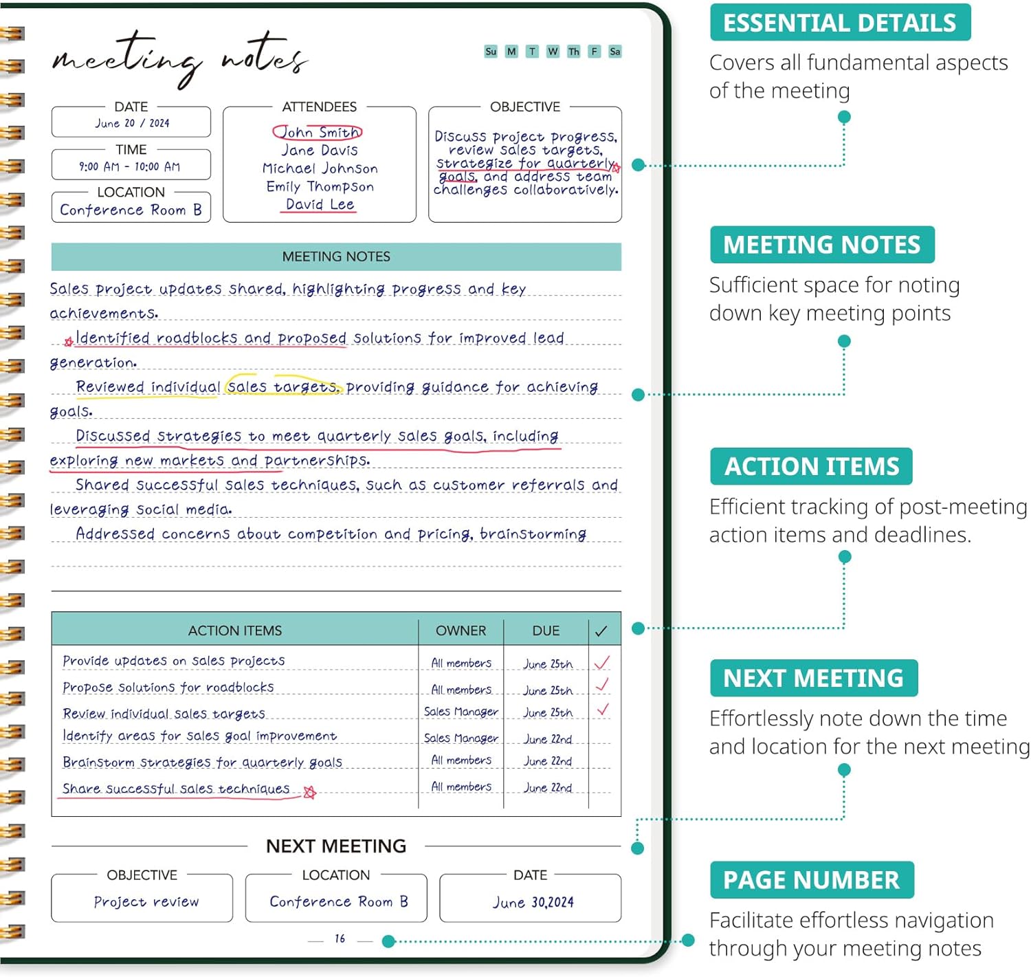- Boost Meeting Efficiency: A meeting notebook helps you manage and streamline meeting details, ensuring discussions, decisions, and action items are accurately captured and organized. It promotes a more efficient workflow, allowing for easy reference and retrieval of information during and after the meeting.