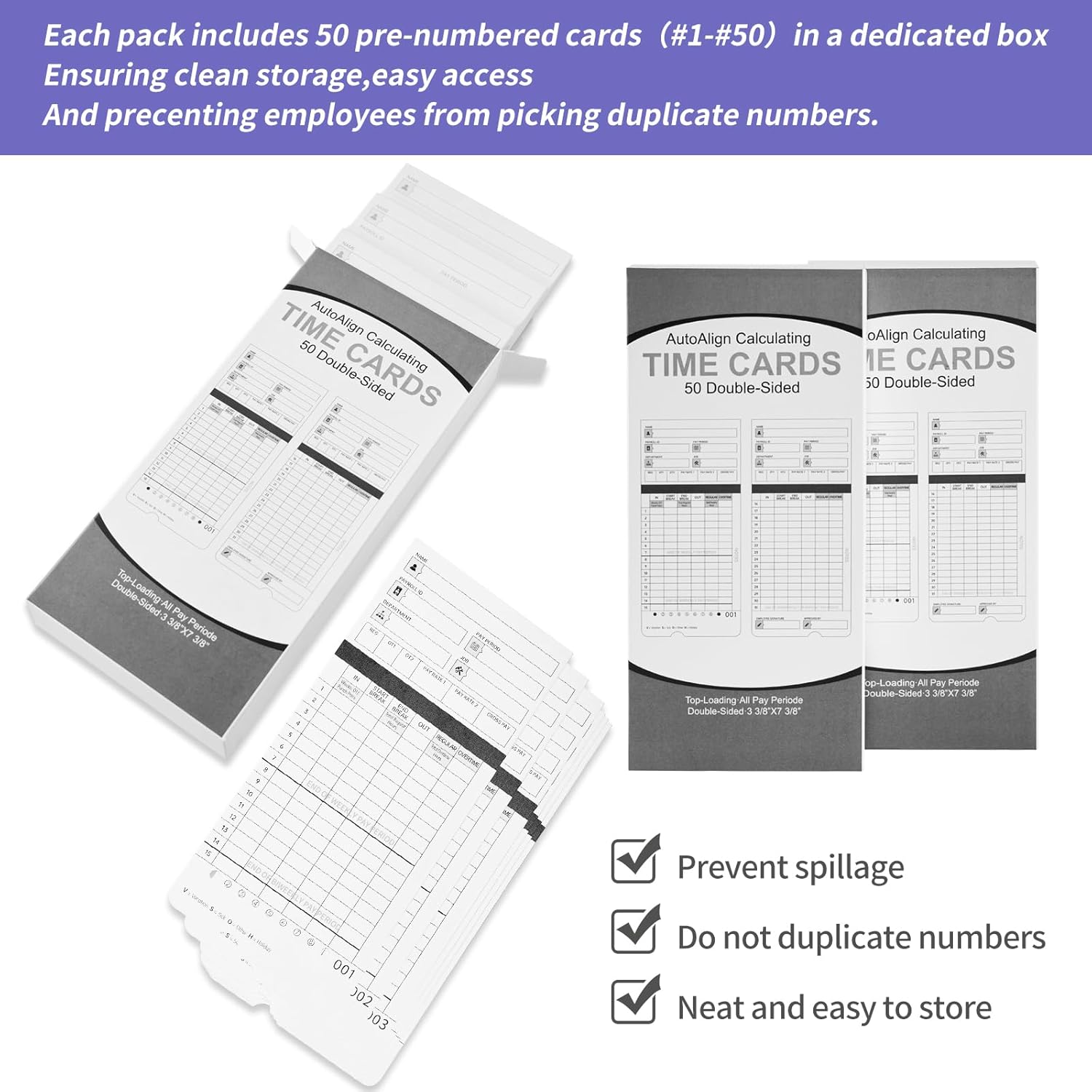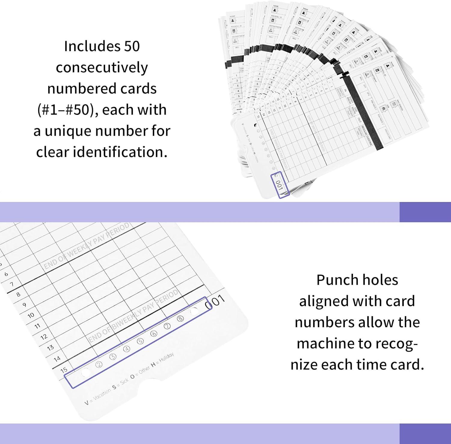 - 300 Time Cards with Organized Numbering Includes 300 employee time cards, packed in 6 individual boxes (50 cards per box), numbered from #1–#50 in each. Helps avoid duplicate entries and improves organization for any time card machine setup.
