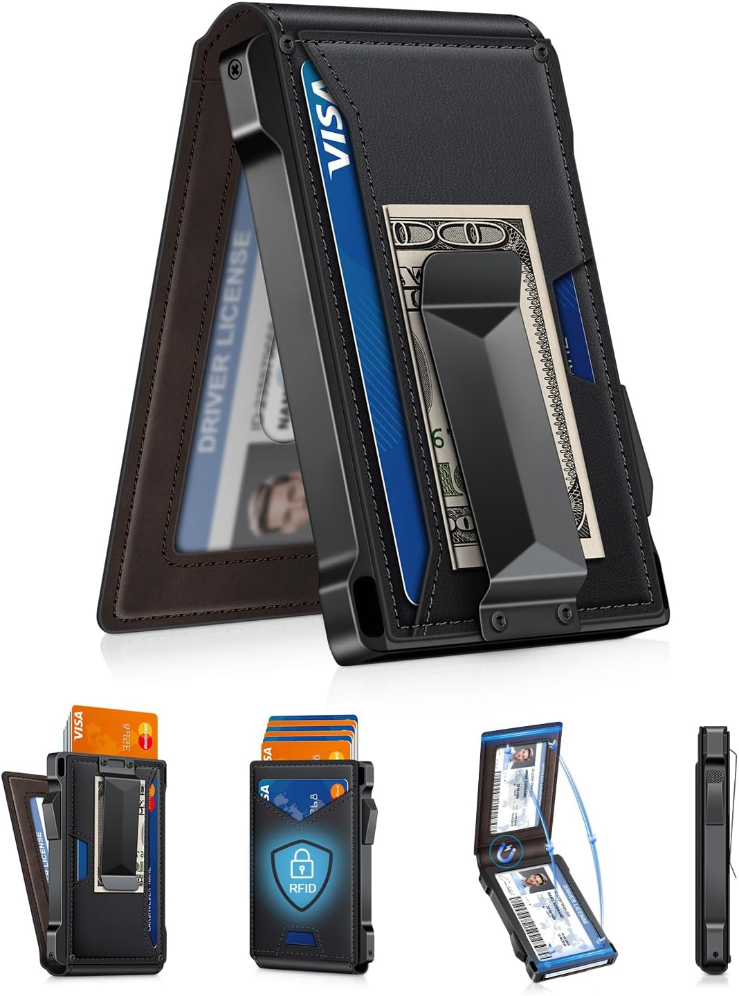 - SLIM BODY WITH LARGE CAPACITY: Despite being slim at only 0.6 inches thick, this card wallet for men can hold 10-12 cards. The aluminum chamber holds 6-8 and the leather flap holds 4 (2 ID windows included). The money clip on the back holds 10+ bills.