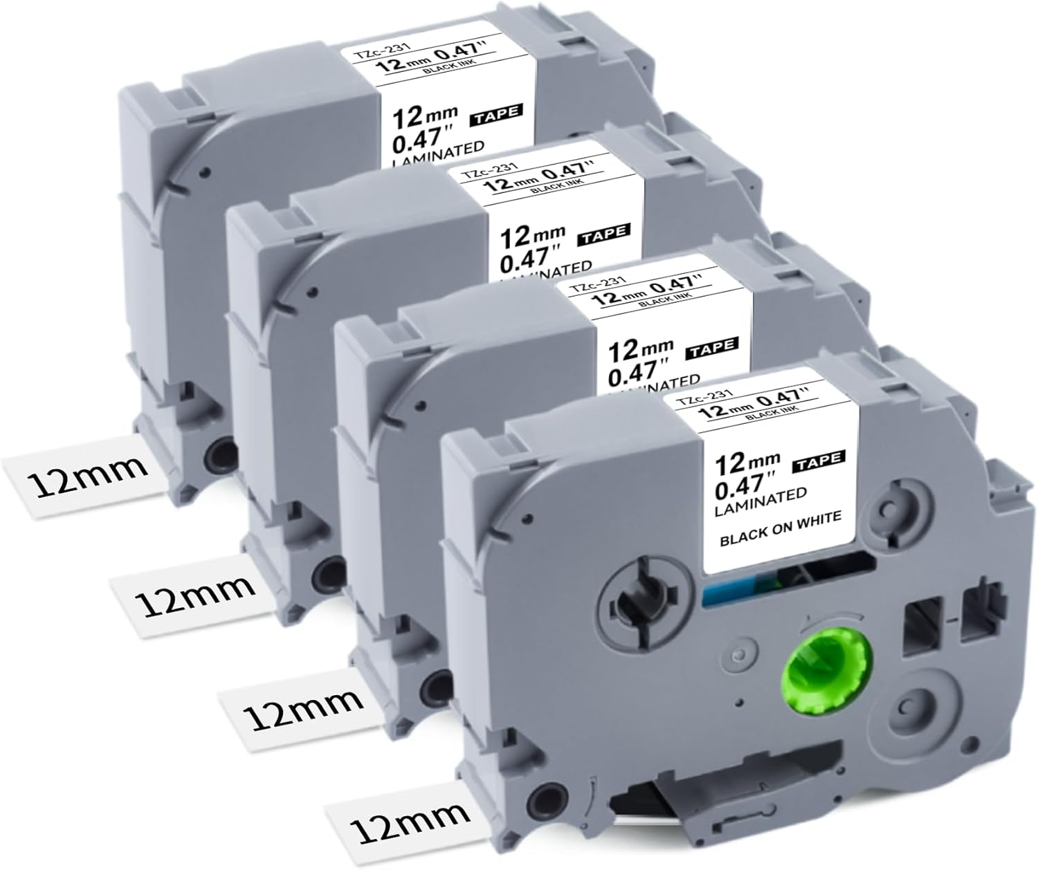 - Product Content: 4-Pack TZe-231 / TZe231 / TZ231 / TZ-231 label tape compatible with Brother 12mm 0.47 laminated tz tape. Each roll is 26.2 feet (8m) long. Color: Black print on white label tape. Fits small items like USB drives, spice jars, and jewelry boxes, 4-pack meets long-term home/office labeling needs.