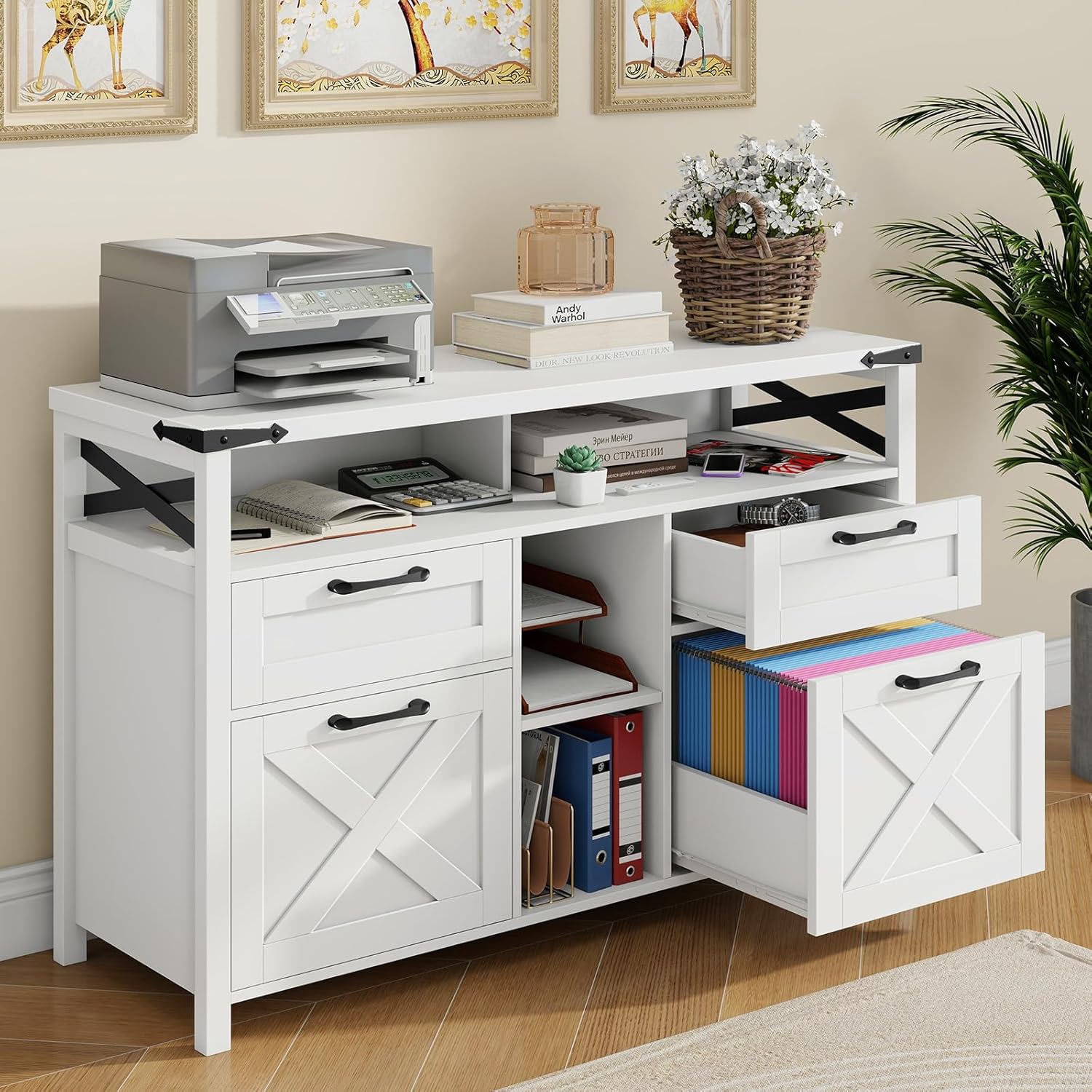 Farmhouse Filing Cabinet with Adjustable Shelf for Home Office, Lateral File Cabinets 4 Drawers with Open Storage Shelf, Filing Organization Storage Cabinets for Hanging Files Letter/A4.(White)